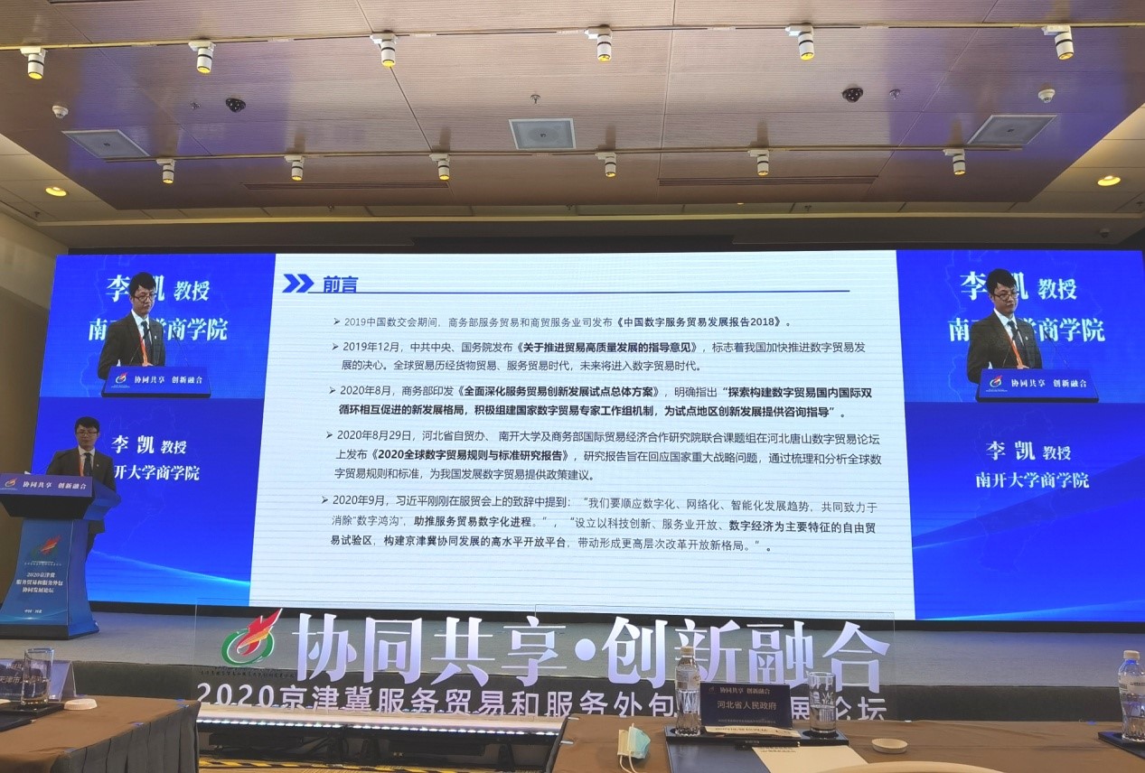 2020年9月5日,竞博官网数字商务研究中心主任李凯教授受主办方邀请,参加在国家会议中心举办的2020中国国际服务贸易交易会,并在2020京津冀服务贸易和服务外包协同发展论坛做题为“全球数字贸易规则分析与发展提议”的主旨演讲。