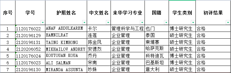 初评结果(详见本公示附表):7名国际学生为合格。
