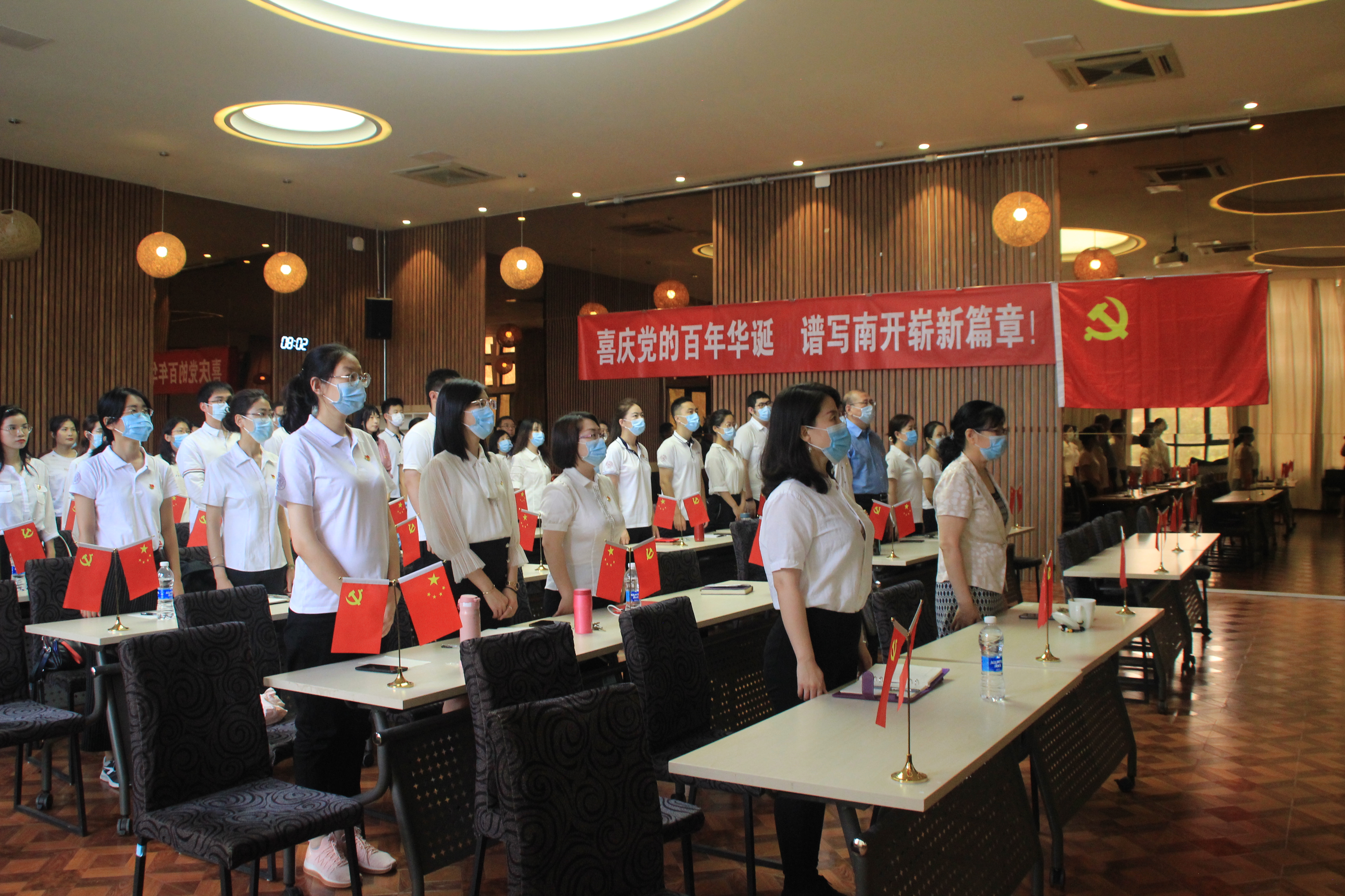 紧接着伴随着国歌响起,全体党员肃穆起立,齐声高唱国歌。在这个庄严而伟大的日子里,在场党员们深切回忆起我党带领全国人民走过的这一百年来,通过无数革命先烈及前辈的光荣付出,所创造的辉煌成就!同时也对在党中央的正确引领下,完成下一个一百年的伟大目标,实现伟大复兴的中国梦充满了希望。